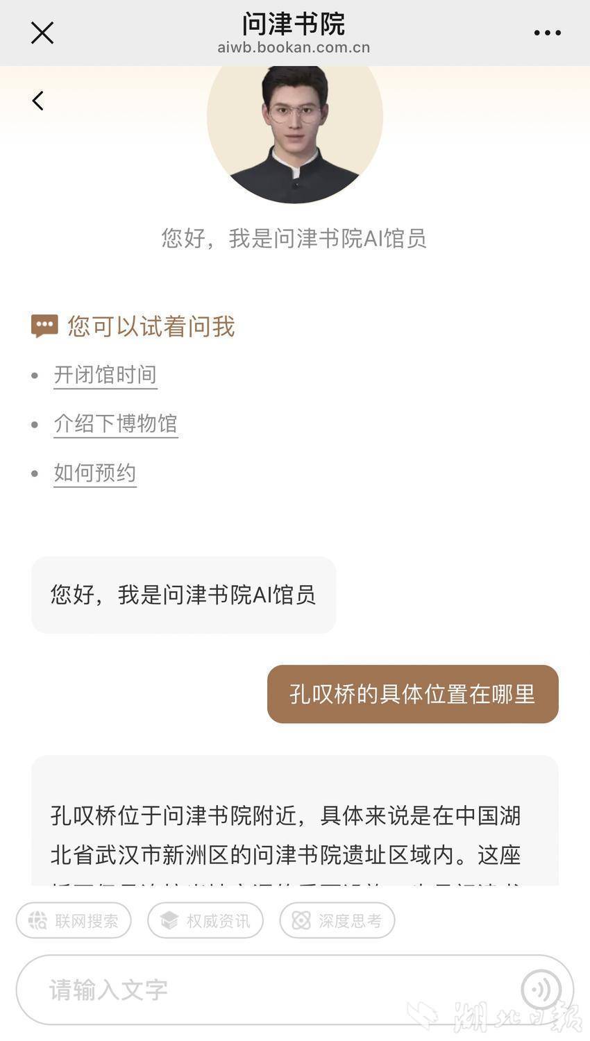 据新洲区问津书院管理中心主任胡杏荣介绍,AI馆员高效融合DeepSeek算法与权威史料数据库,24小时响应咨询,无论是计划前来参观的游客,还是想深入了解问津书院,AI馆员24小时不间断守候,量身定制个性化、智能化服务,让游客尽享便捷的参观之旅。更值得一提的是,其不受时空限制的特性,让游客离院后仍可随时查询,上线不足一月,AI馆员已成为游客了解书院的“贴身向导”。