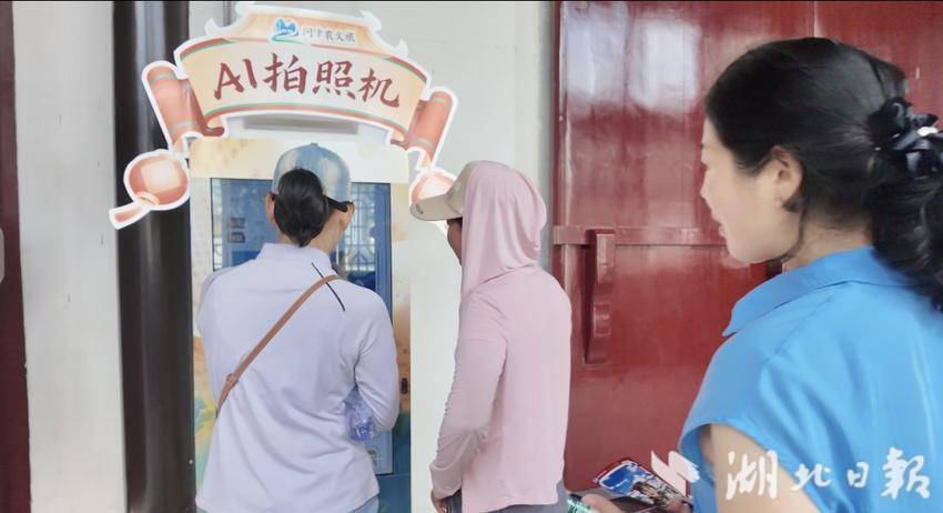 在问津书院仪门背后,线下AI照相机前正排着小队。李女士站到镜头前,屏幕上立刻弹出“问津书院”古风场景模板。按下快门的瞬间,系统自动将她的影像与古画风格背景融合生成图片并打印出来。“不用修图就能拍出古风大片,太适合发朋友圈了。”她还将电子照片保存到手机留作纪念。